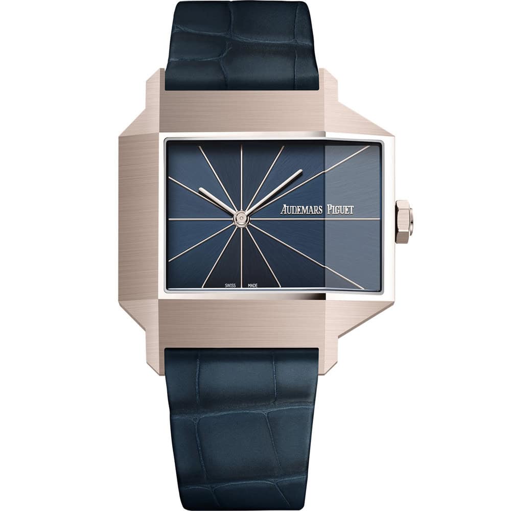 The dial, in the same shade of blue first used for the Royal Oak, is composed of twelve triangles, and each PVD-coated brass piece has been given a linear brush so it resembles wood marquetry.