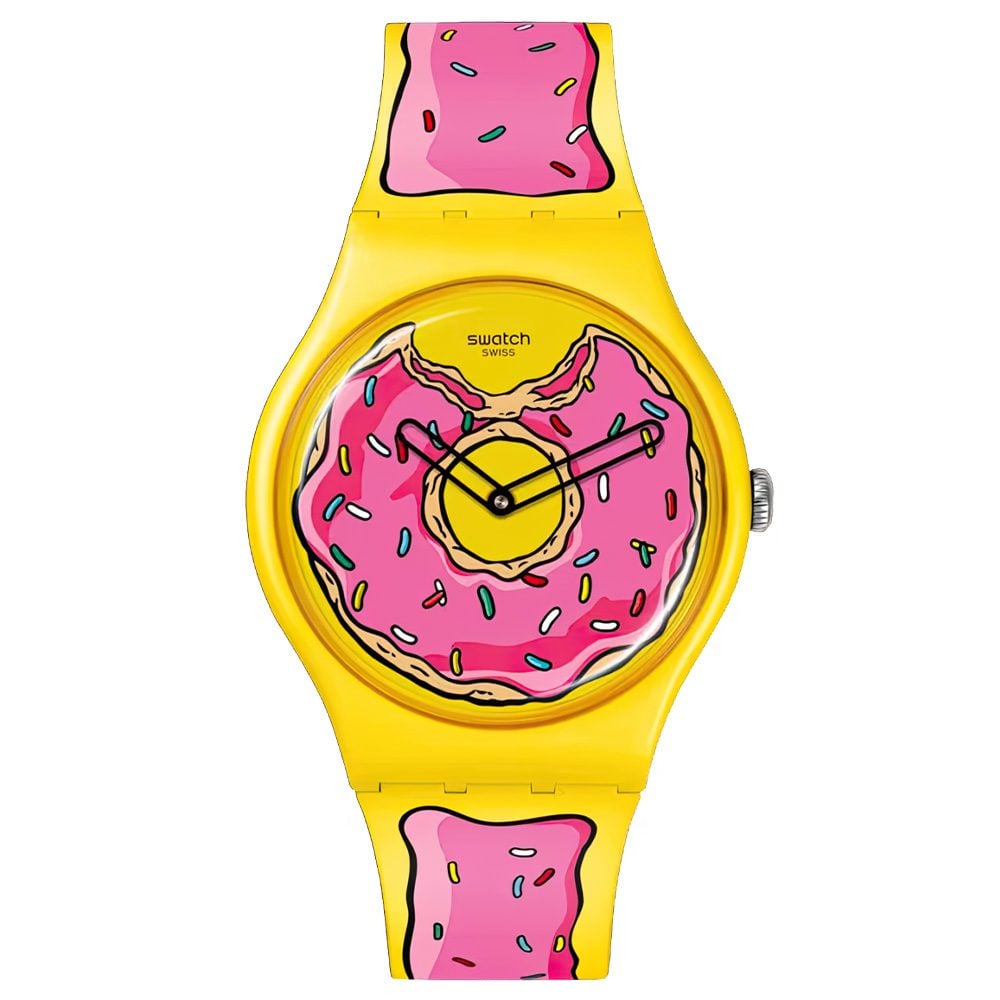 In November, Swatch unveiled its Seconds of Sweetness, which took Homer’s famous pink doughnut and stuck it on a watch dial. A bite had been taken out of it at 12 o’clock and its pink, sprinkle-flecked frosting adorned the strap with a background in the famous Simpsons’ shade of yellow.
