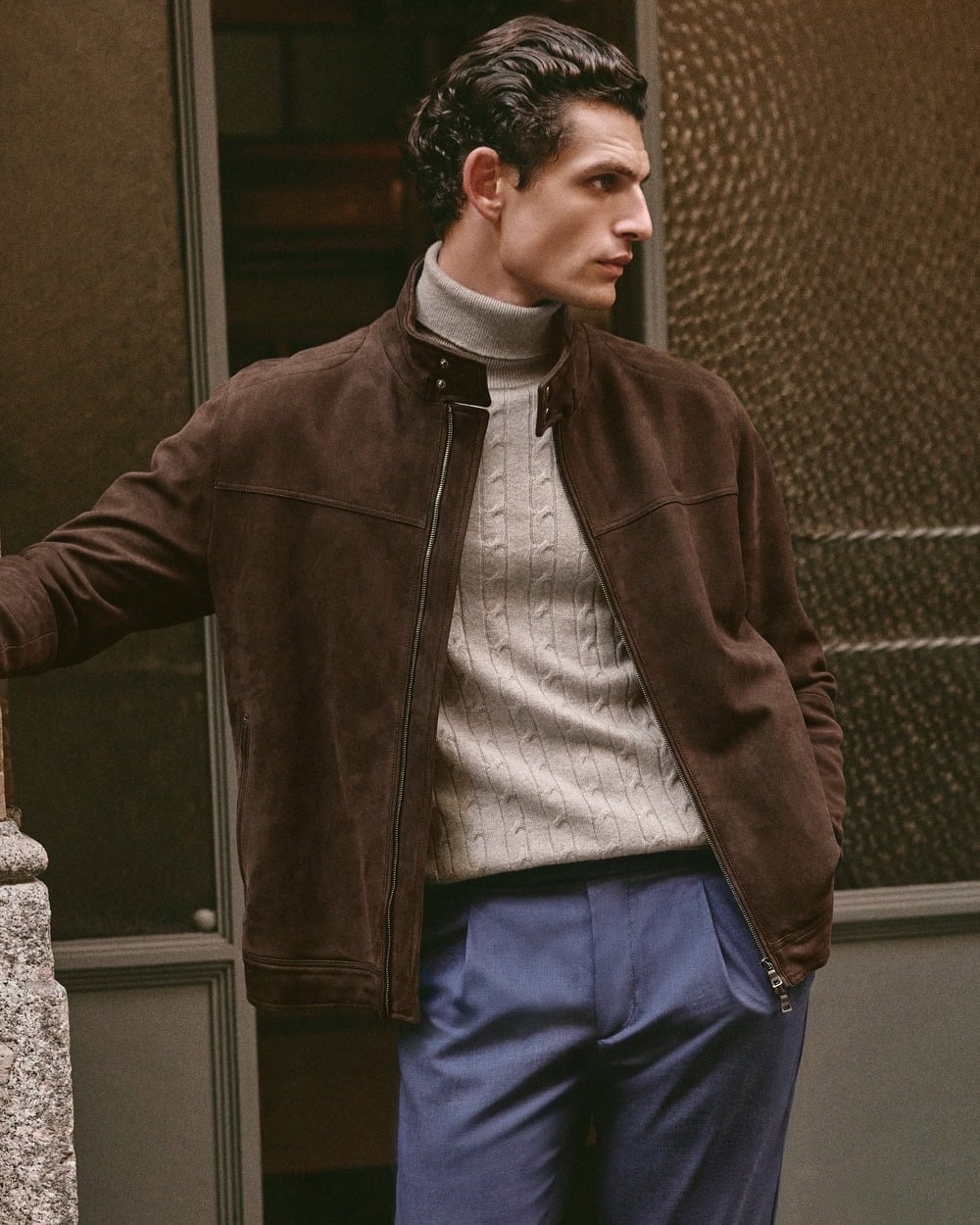 No material showcases deep, rich tones as effectively as suede, making it the perfect canvas for brown. Aside from footwear, the most obvious way to include it in your wardrobe is via a suede jacket.