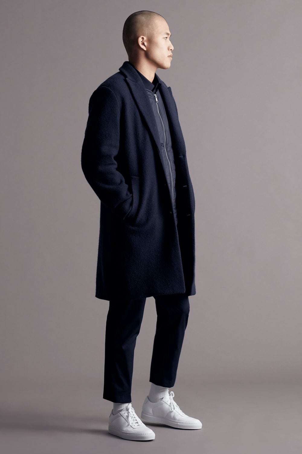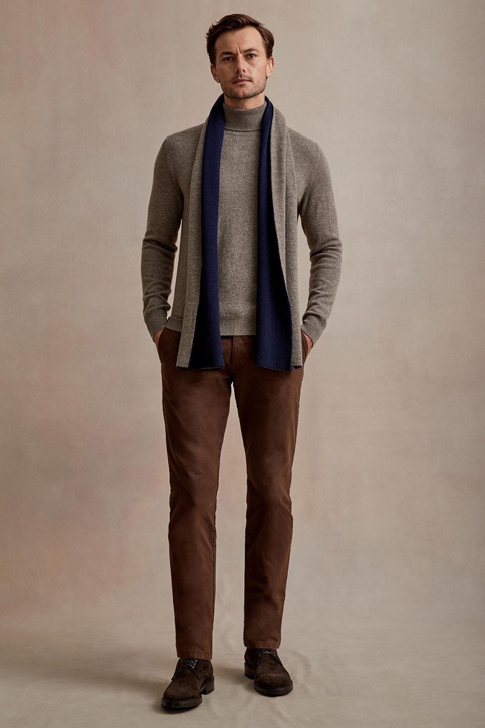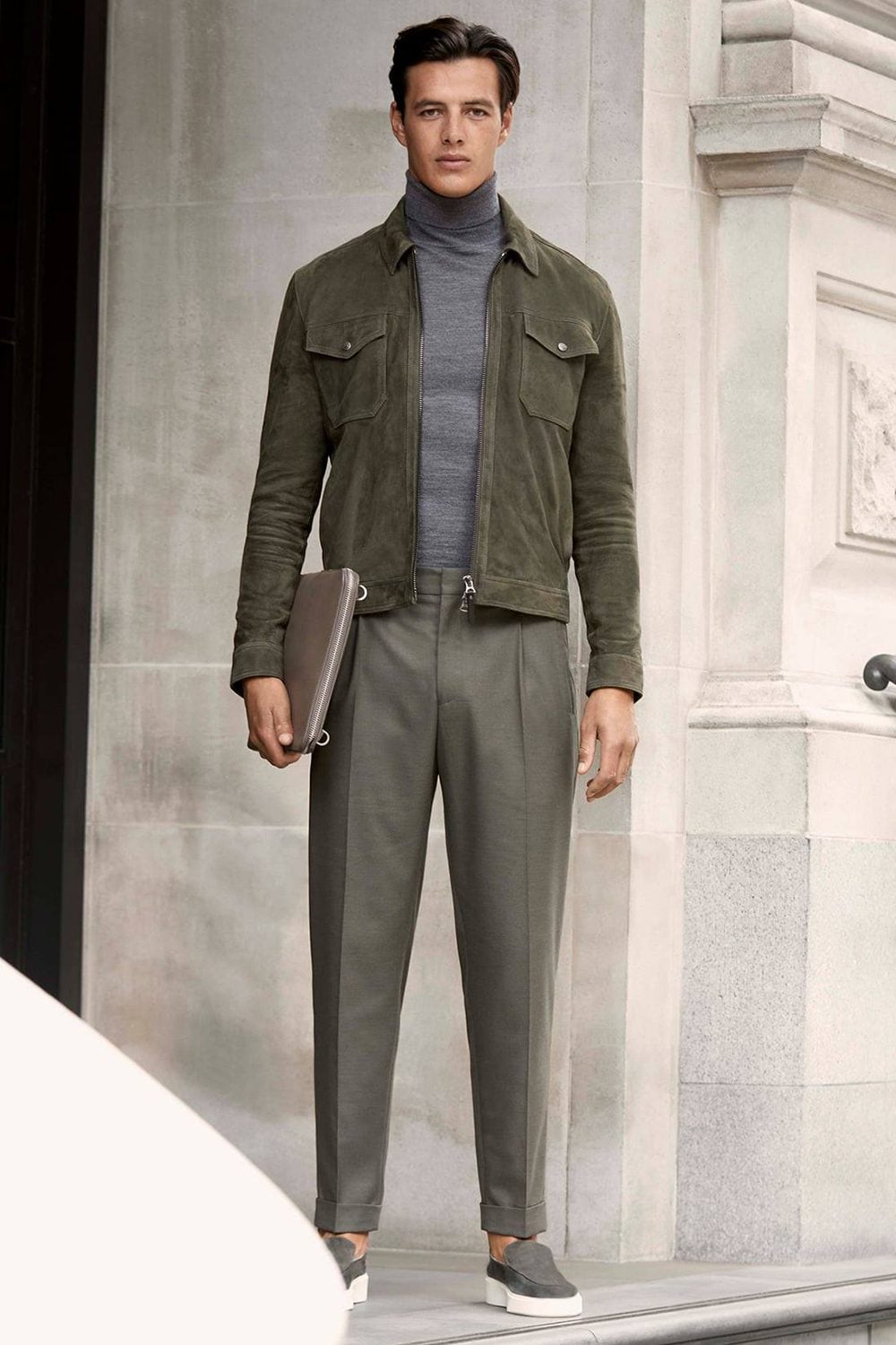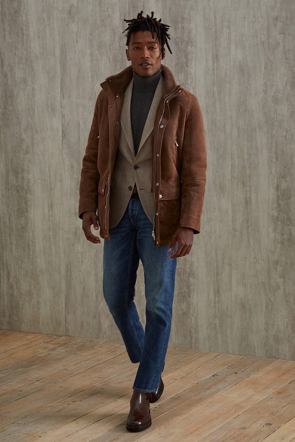 Just remember to look for a range of textured fabrics in your look. Think leather, moleskin, cotton twill or lambswool – materials that add a bit of visual interest, keeping your outfit from appearing too flat.