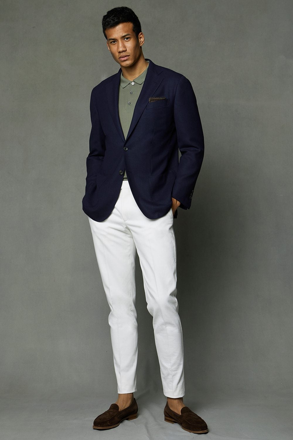 A traditional blazer usually features heavily roped shoulders, which create sharp, powerful lines that are inherently formal and associated with business wear. An unstructured jacket on the other hand looks more laid back and natural, so it easily combines with casual attire like chinos, T-shirts, polo shirts and knitwear. If you’re going to wear a blazer as part of a smart casual look, make sure it’s unstructured.