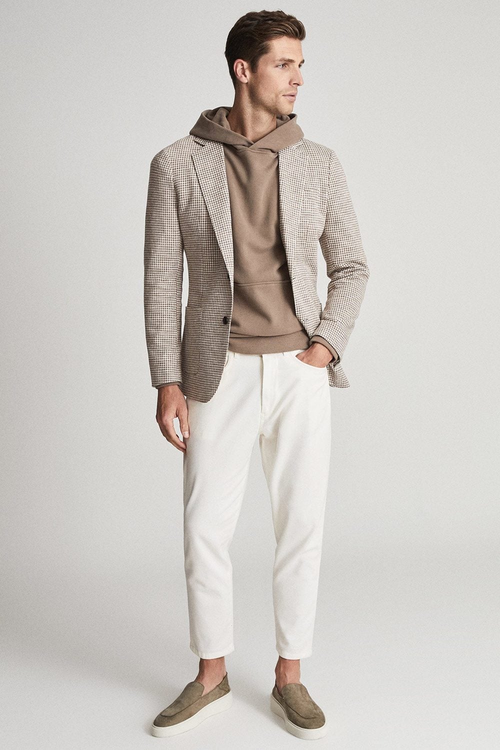 To make it smart casual, all you’d need to do is swap the hoodie for an unstructured blazer, and you’re there. Or, keep the hoodie and add a slimline bomber jacket and Derby shoes in place of sneakers.