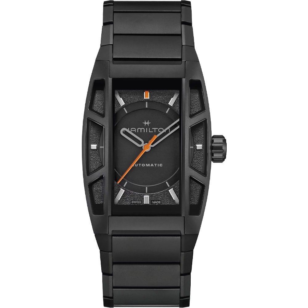 To tap into the post-apocalyptic vibe, Hamilton worked with the game’s art director, Yoji Shinkawa, to give some menace to its Boulton design that debuted in 1941. This is a dark watch. The only colour on this PVD-coated titanium cased timepiece is the orange on the hands.