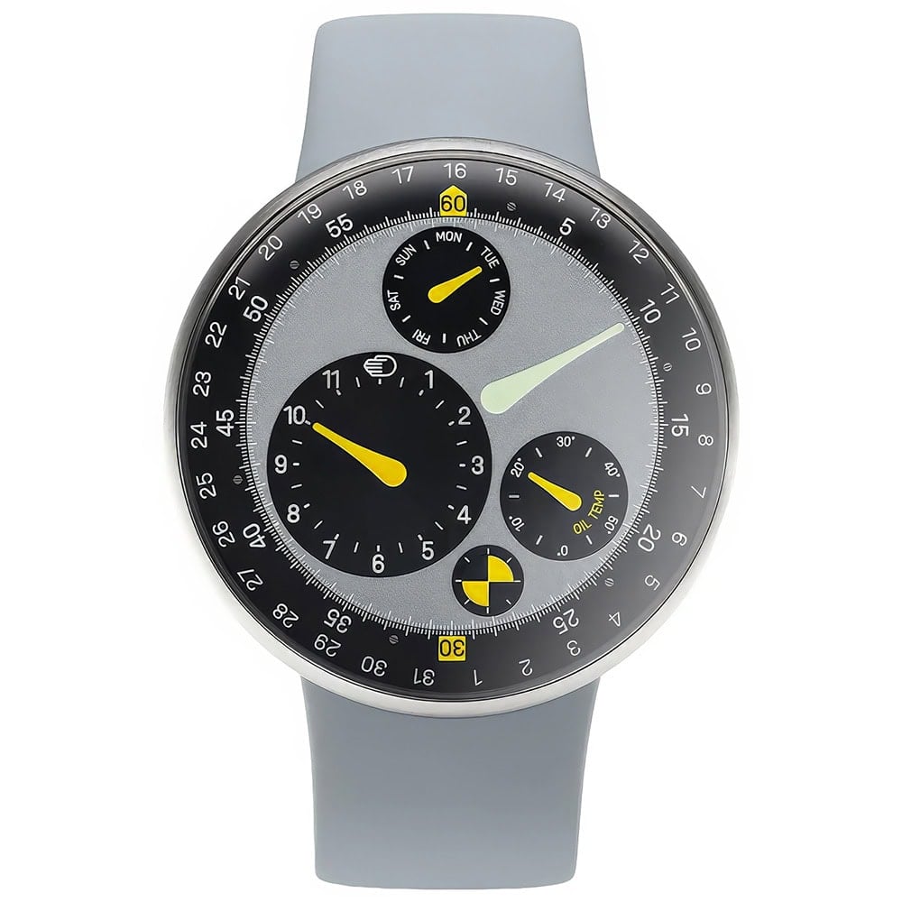 The result is a Type 3 – Ressence’s oil-filled design – with a Newson touch. It is his 40 years of design condensed into 44mm. Minimal hands from his 1990s Ikepod watch, his signature colour palette of greys and blacks with vibrant yellow and celadon green, and the smooth elliptical silhouette.