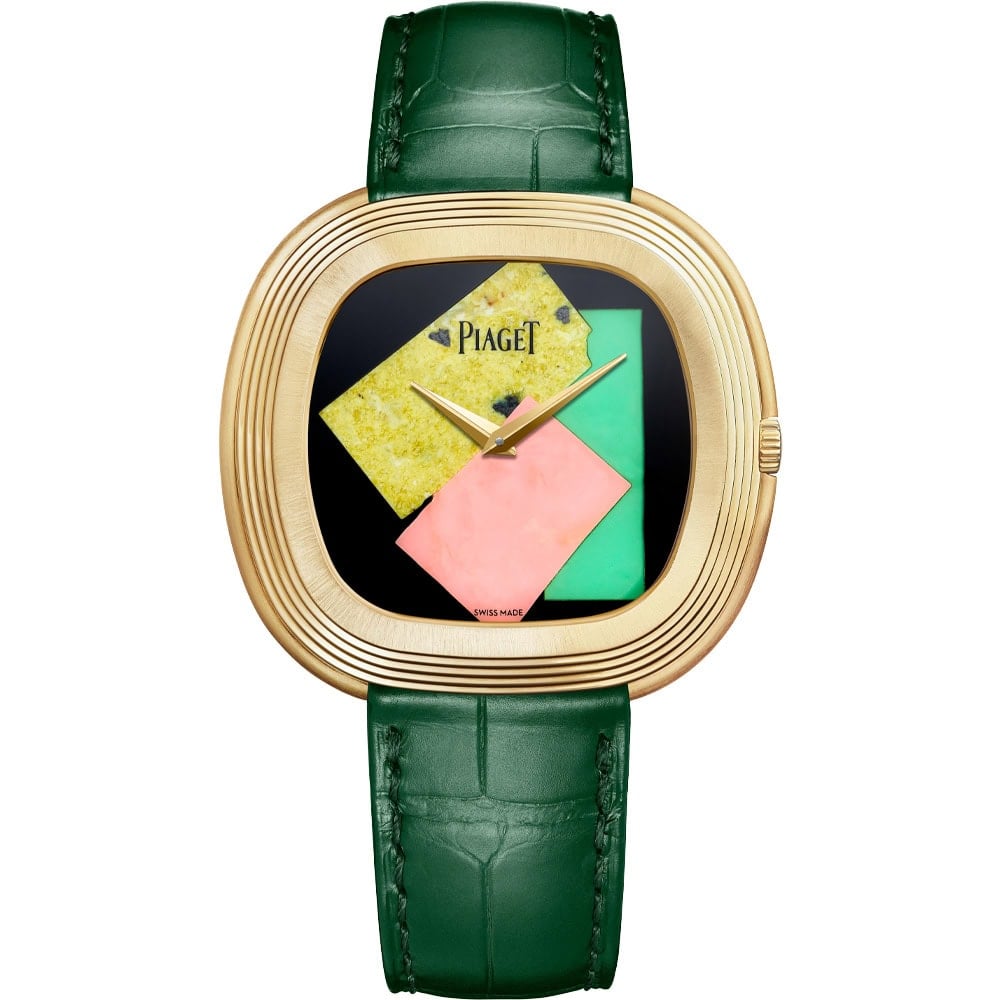 As collaborations go, this one between Piaget and the Andy Warhol Foundation for the Visual Arts was a highlight. To pay homage to the Pop-Art artist, Piaget chose yellow Namibian serpentine, pink opal, and green chrysoprase to create a surrealist rendering of Warhol’s self-portrait in his ‘fright wig’.