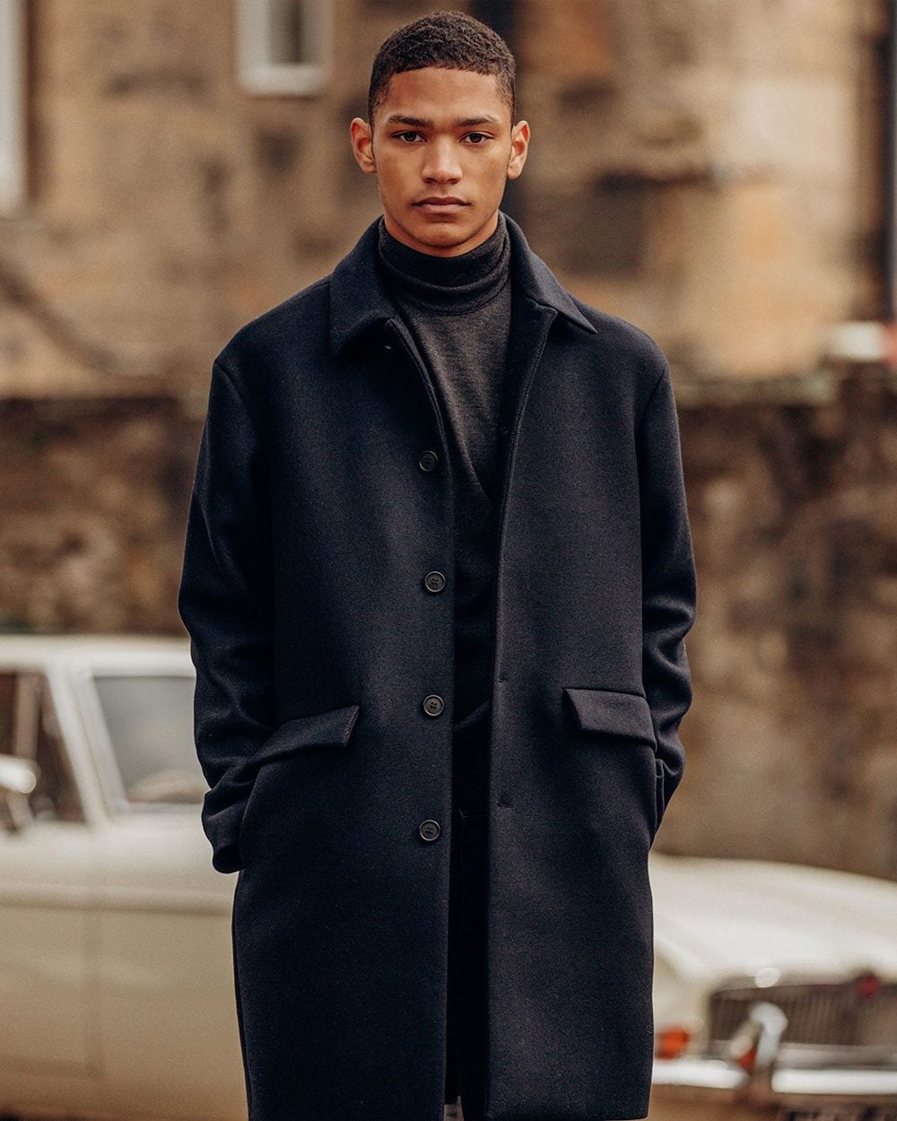 The car coat is basically a single-breasted dense woollen layer, buttoned up to the neck, with a collar that can be turned up against the wind. It typically has two diagonal front welt pockets and is cut relatively short, to the upper thigh, with a slight A-line flair and without a rear vent, precisely to make it comfortable while seated.