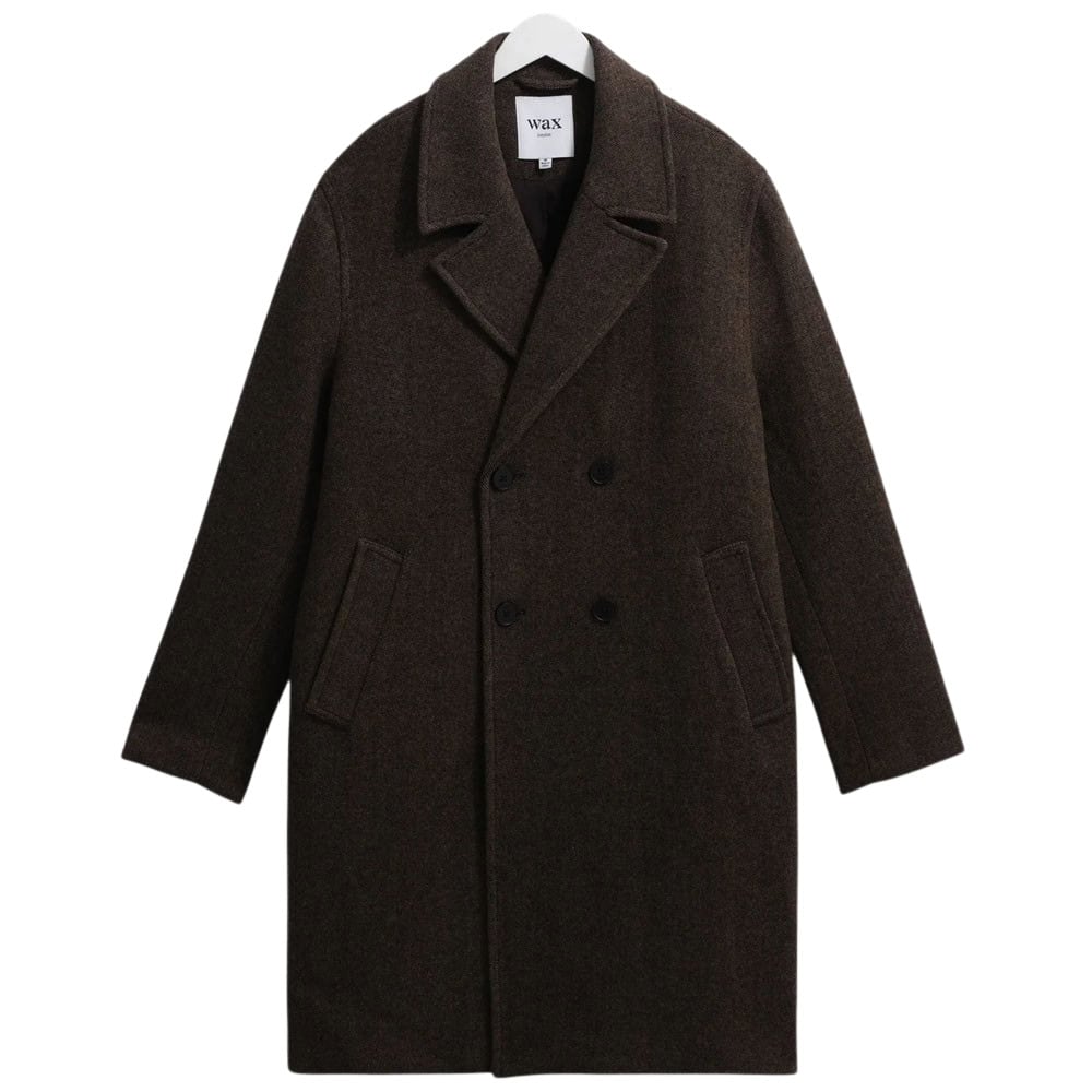 - Wax London Magnus – Brown Herringbone Double-Breasted Wool Overcoat