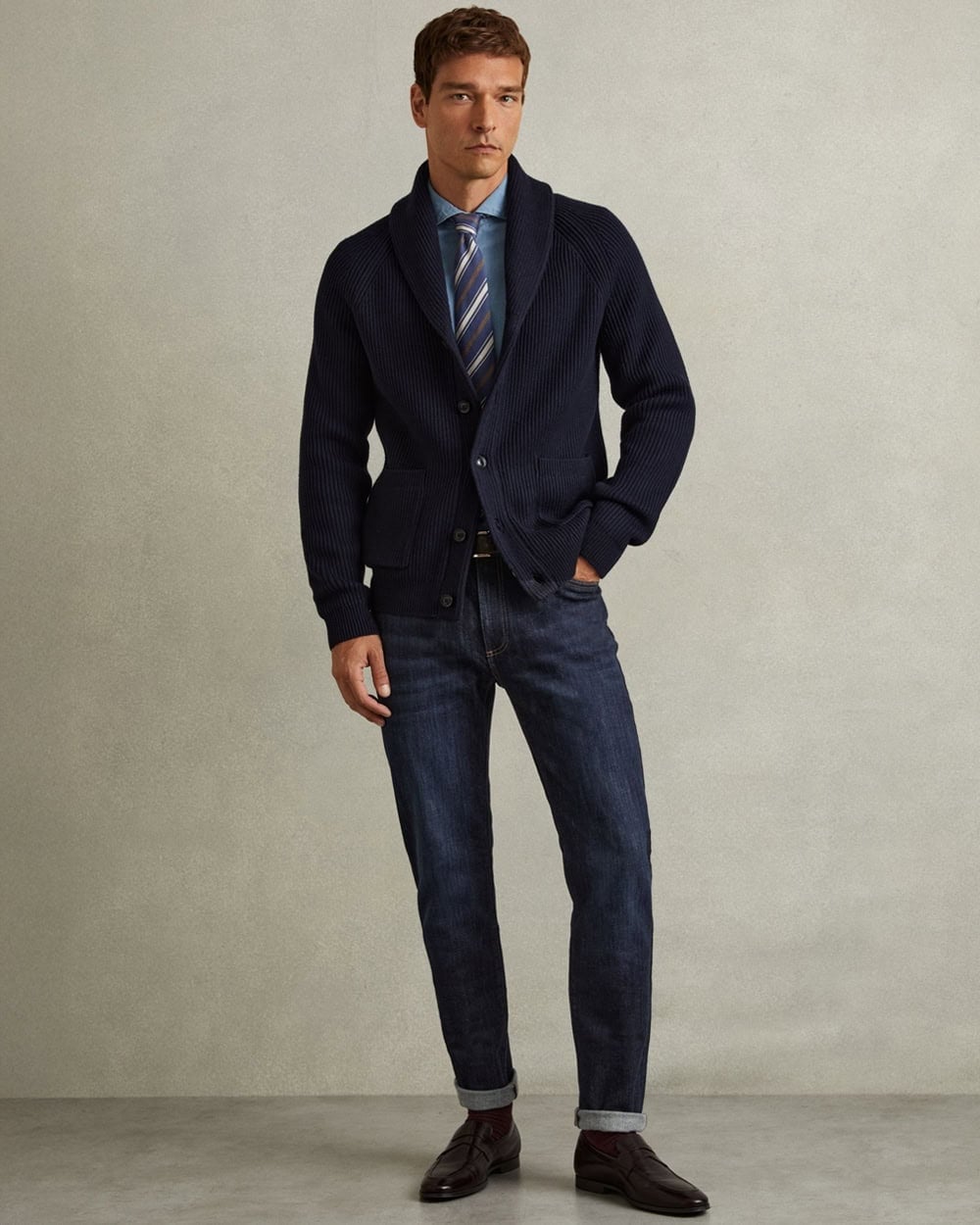 The appeal of dark-rinse denim lies in its versatility. It sits comfortably at the crossover of casual and polished, which is exactly where modern menswear lives. You can wear a deep indigo jean with a chunky knit and boots at the weekend, then throw on a wool coat and Chelsea boots on Monday and look entirely office-appropriate.
