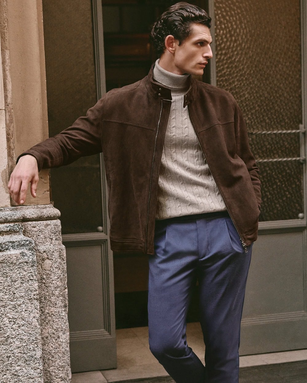 Taking the formality up a notch while still keeping it cool, a rollneck paired with a leather or suede jacket is the perfect option for evenings out, date nights, and the like. It’s smart, but not too smart. It shows you’ve made an effort, but you’re not trying too hard.