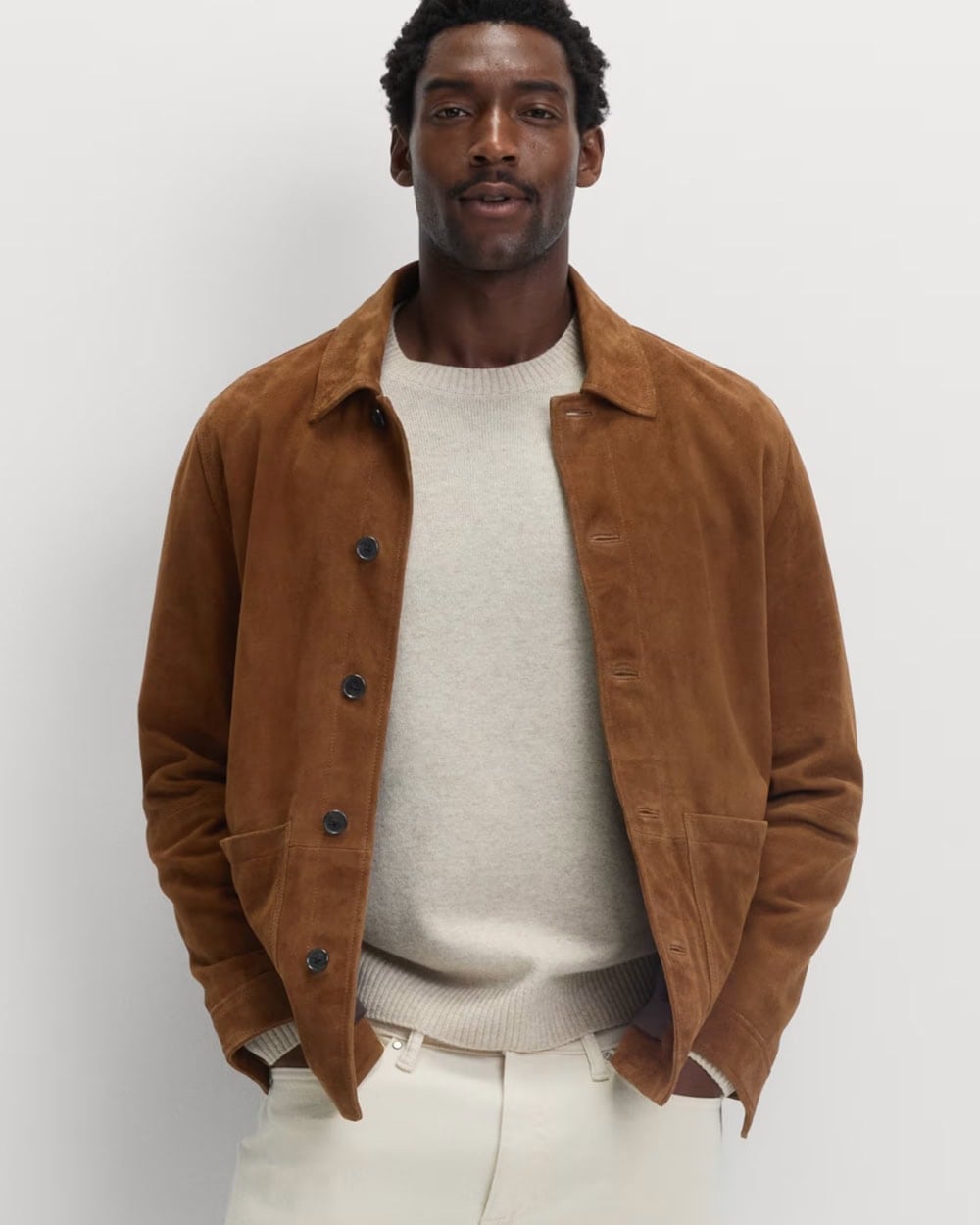 If you go dark with the jacket, go light with the knitwear, and vice versa. A khaki overshirt—the most reliable light jacket in menswear—and a cream crew neck are always a winning combo. Think a nice heavy Aran sweater if it’s winter, or a fine-gauge merino in the autumn.