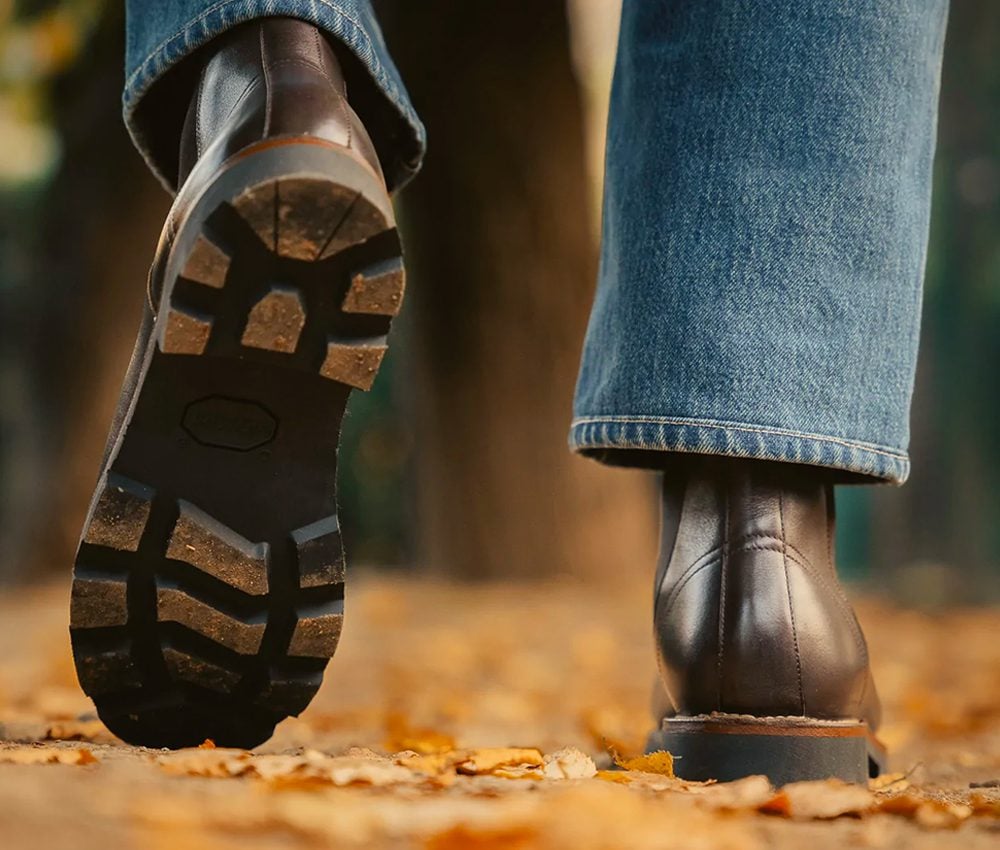 What you need is a thick, ‘commando’ tread. It’s a heavy, lugged sole that grips well and offers steady footing in the wet weather. Alternatives that look – and perform – just as good include ‘Vibram’ and ‘Para’ soles.